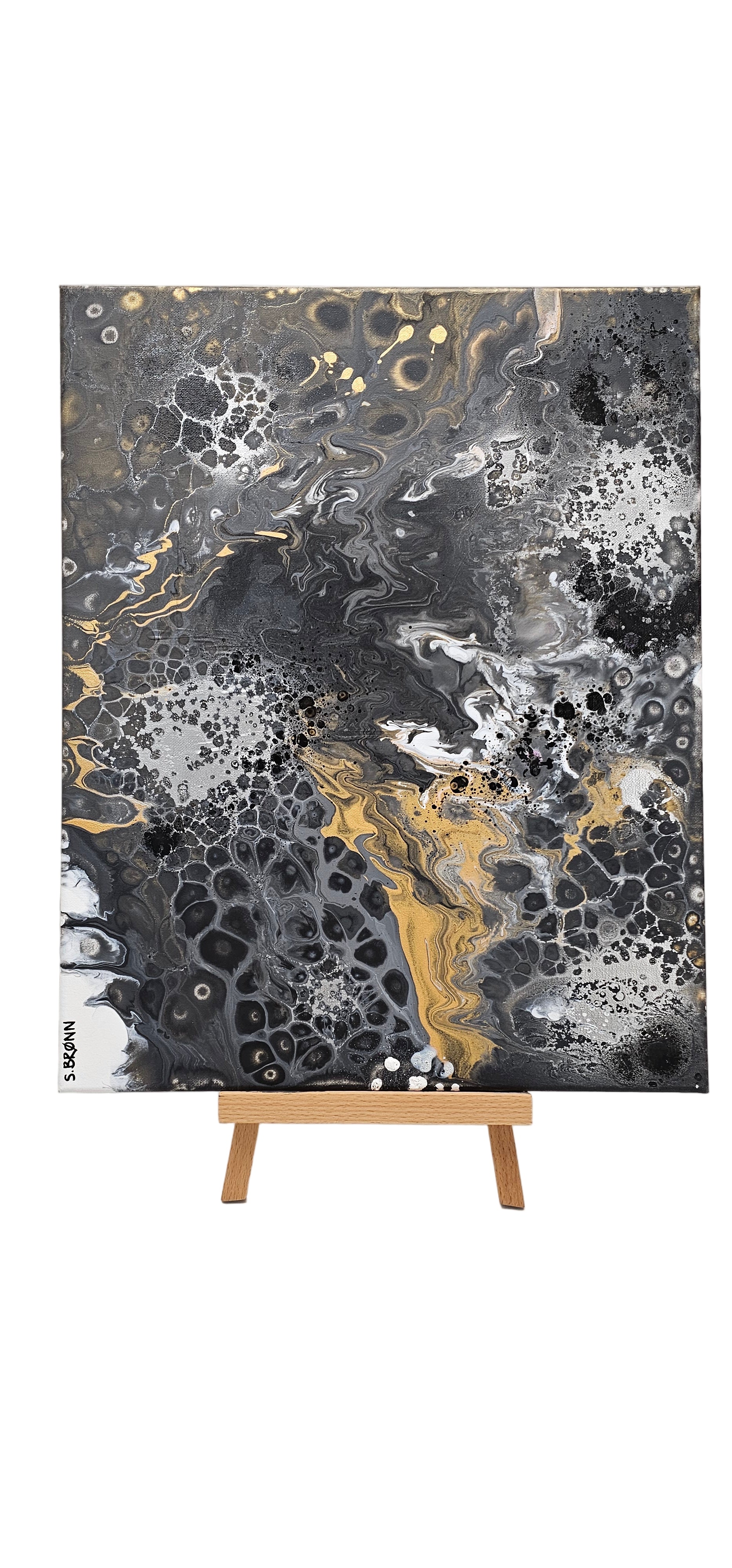 In fliessenden Bewegungen aus Schwarz, Gold und Grau entfaltet sich eine Welt zwischen Chaos und Harmonie. Formen entstehen und vergehen, wie Erinnerungen, die im Nebel der Zeit tanzen. Goldene Linien durchziehen die Dunkelheit. Spuren von Licht, das sich seinen Weg durch Schatten bahnt.